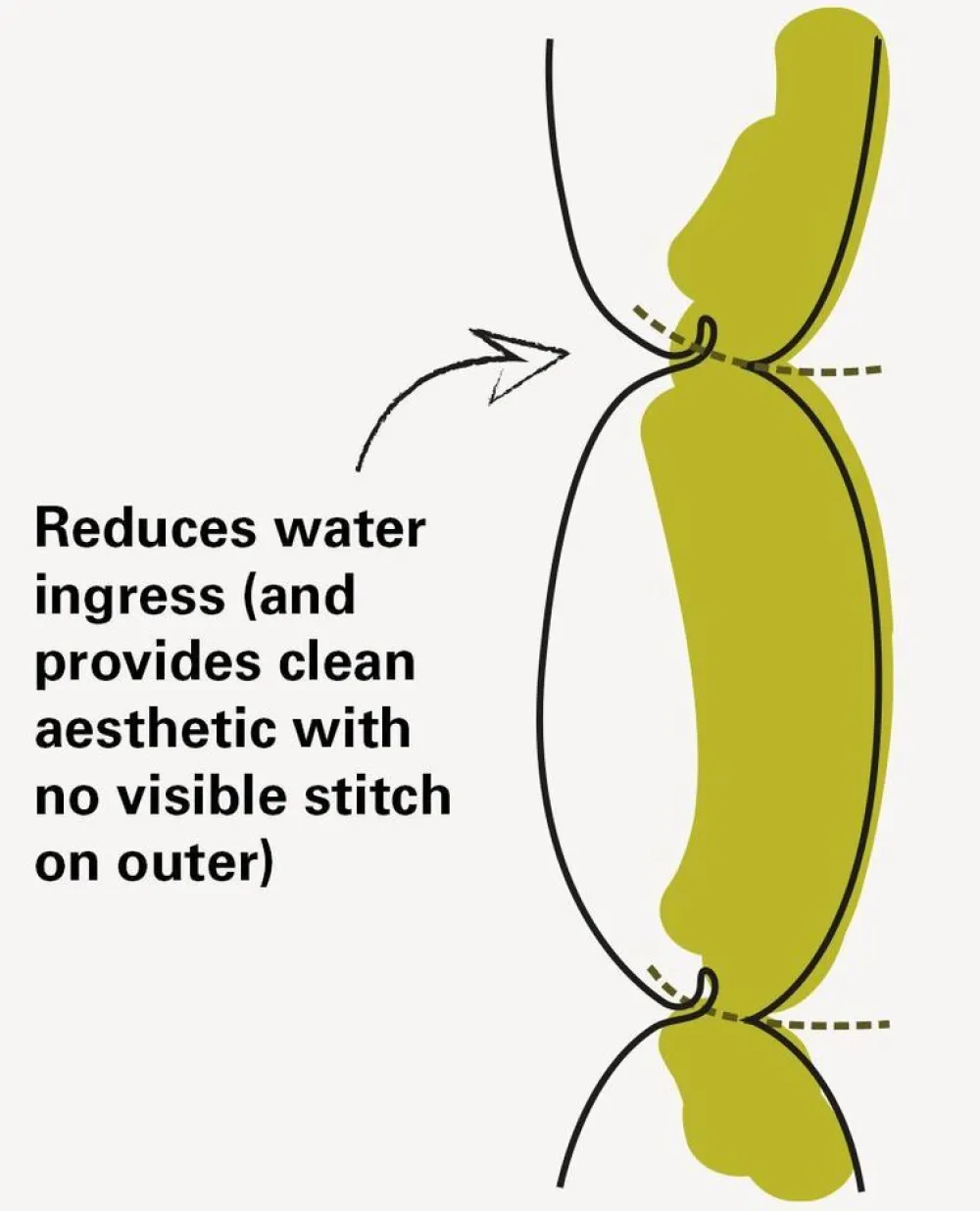 - Doorgestikte constructie met technisch geavanceerde ‘switch-back’-naadconstructie op het lichaam om het binnendringen van water te verminderen