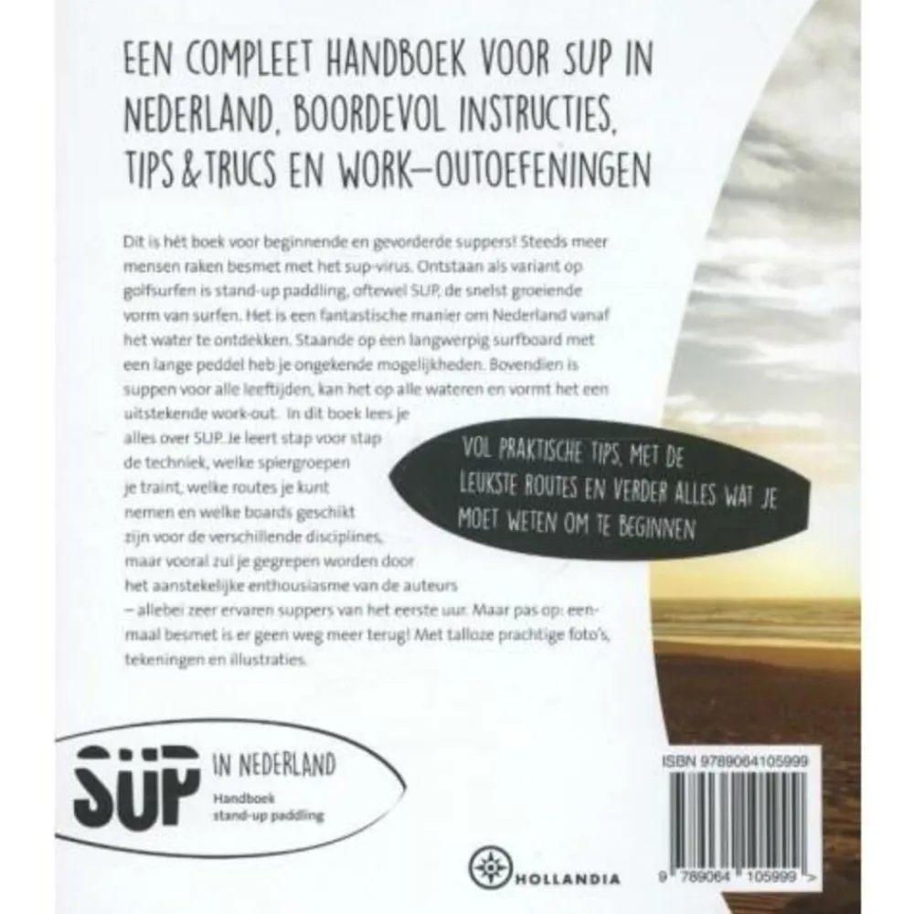Steeds meer mensen worden besmet met het sup-virus. Ontstaan als variant op golfsurfen is stand-up paddling, oftewel sup, de snelst groeiende vorm van surfen. Het is een fantastische manier om Nederland vanaf het water te ontdekken. Staand op een langwerpig surfboard met een lange peddel zijn de mogelijkheden ongekend. Suppen is voor alle leeftijden, het kan op alle wateren en het is een uitstekende work-out. In dit boek lees je alles over sup. Je leert stap voor stap de techniek, welke spiergroepen je traint, welke routes je kunt nemen, welke boards geschikt zijn voor de verschillende disciplines, maar vooral word je gegrepen door het aanstekelijke enthousiasme van de auteurs – allebei zeer ervaren sup’ers van het eerste uur. Maar pas op! Eenmaal besmet is er geen weg meer terug…