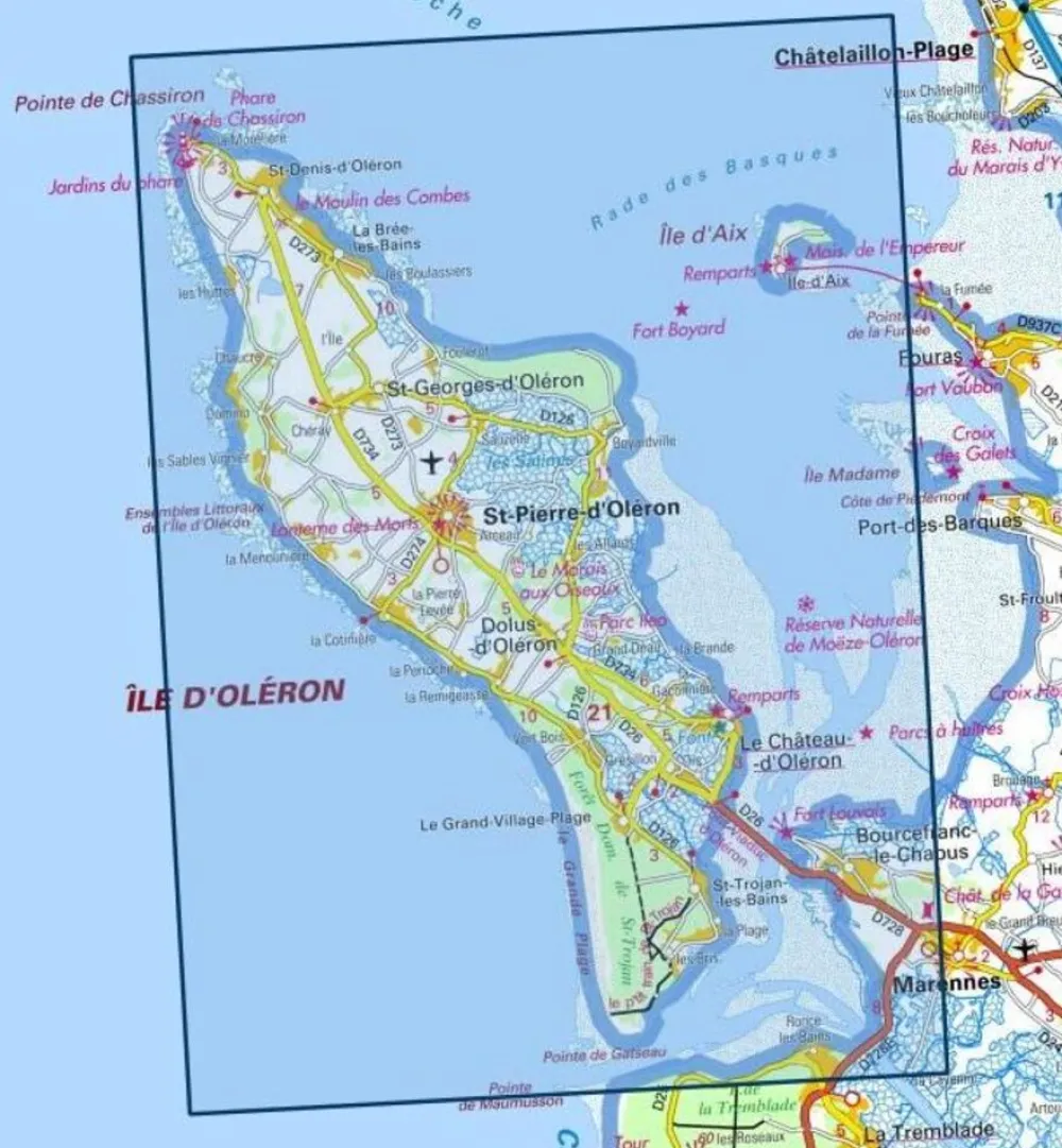 Steden/dorpen/bergen/gebieden: Île d’Oléron, Île d’Aix, Saint-Pierre-d’Oléron, Saint-Trojan-les-Bains, Le Château-d’Oléron