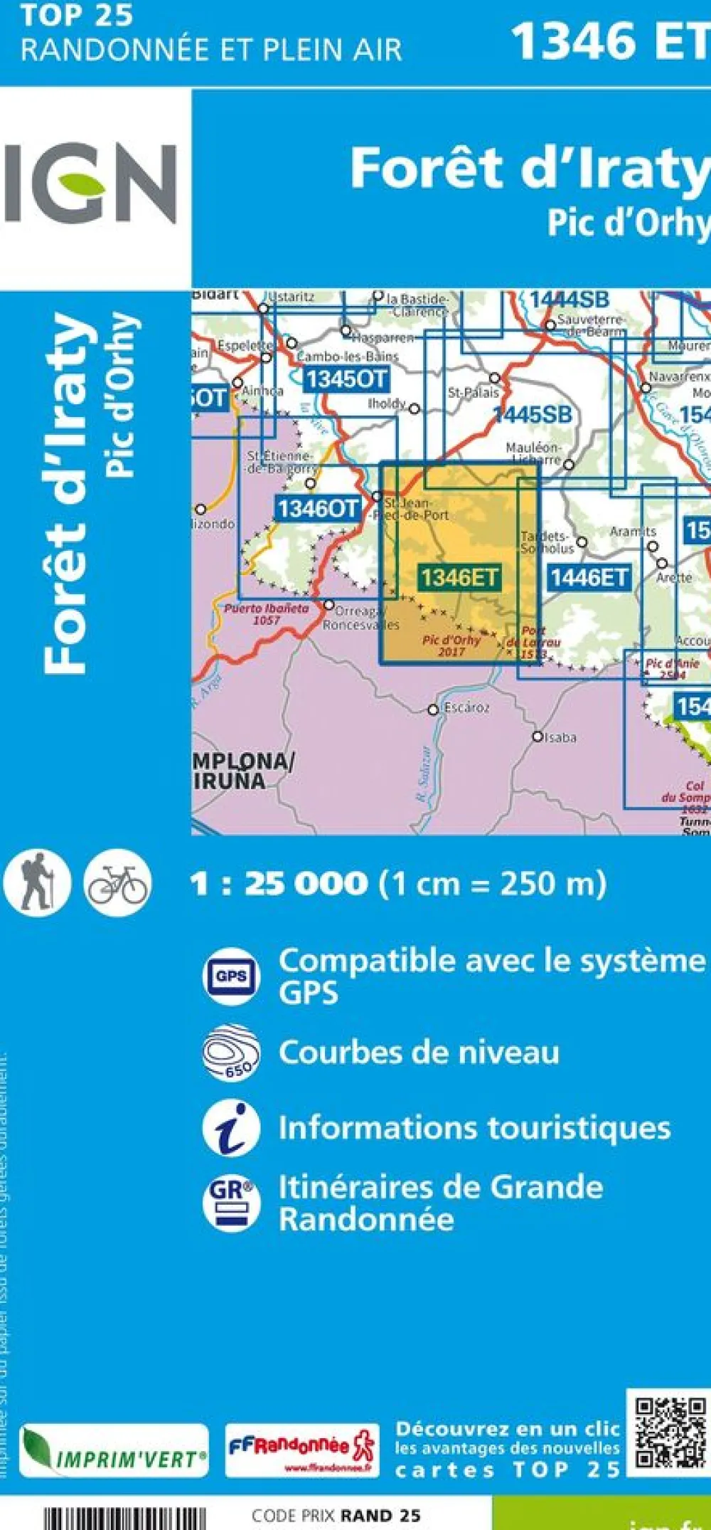 L’indispensable carte de randonnée IGN 1346ET. D’une très grande précision, elle contient tous les détails existants sur le terrain : voies de communication jusqu’au moindre sentier, constructions jusqu’au hangar, bois, arbre isolé, rivière, source… Sans oublier la représentation du relief par des courbes de niveau. Les sentiers balisés et les informations touristiques sont également représentés.