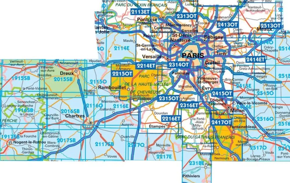 De rest van Frankrijk wordt in kaart gebracht met de “Série Bleu” (eindigend op O = ouest of E = est) welke geen speciale extra overdruk heeft om de wandelroutes aan te duiden. Op deze kaarten vind je dan ook geen toeristische informatie als campings en hutten; het zijn puur topografische kaarten, maar zoals gezegd bijzonder gedetailleerd. Elke “Série Bleu” kaart bedekt een gebied van ongeveer 20 x 14 km