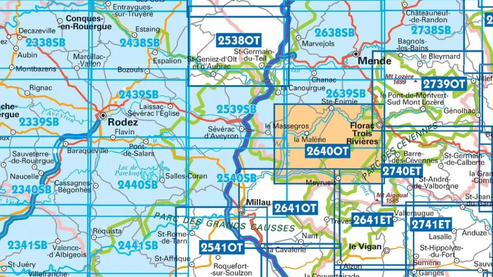 De rest van Frankrijk wordt in kaart gebracht met de “Série Bleu” (eindigend op O = ouest of E = est) welke geen speciale extra overdruk heeft om de wandelroutes aan te duiden. Op deze kaarten vind je dan ook geen toeristische informatie als campings en hutten; het zijn puur topografische kaarten, maar zoals gezegd bijzonder gedetailleerd. Elke “Série Bleu” kaart bedekt een gebied van ongeveer 20 x 14 km