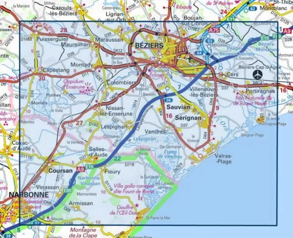 Communes couvertes : Béziers, Pierrerue, Causses-et-Veyran, Capestang, Murviel-lès-Béziers, Bize-Minervois, Quarante, Babeau-Bouldoux, Marcorignan, Prades-sur-Vernazobre, Creissan, Ginestas, Cuxac-d’Aude, Raissac-d’Aude, Moussan, Argeliers, Villespassans, Saint-Chinian, Saint-Nazaire