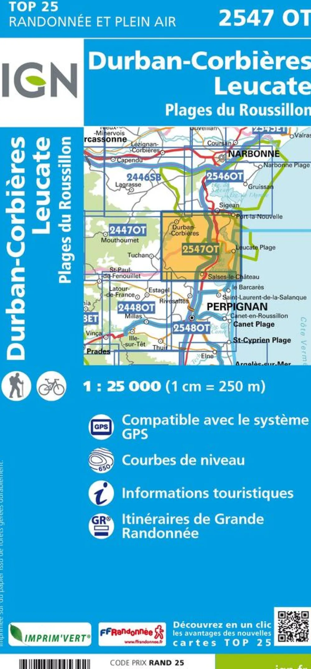 L’indispensable carte de randonnée IGN 2547OT. D’une très grande précision elle contient tous les détails existants sur le terrain : voies de communication jusqu’au moindre sentier, constructions jusqu’au hangar, bois, arbre isolé, rivière, source… Sans oublier la représentation du relief par des courbes de niveau. Les sentiers balisés et les informations touristiques sont également représentées.
