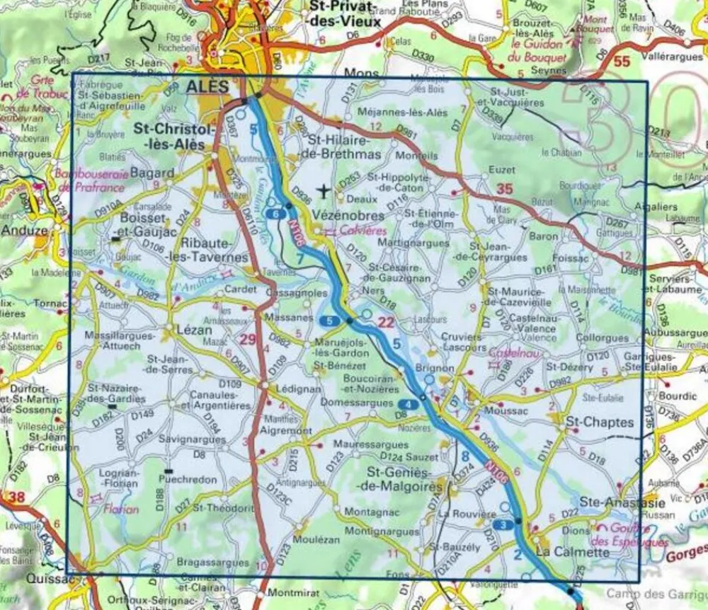 Communes couvertes : Vézénobres, Moussac, Aigaliers, Massanes, Puechredon, Cassagnoles, Baron, Foissac, Seynes, Dions, Saint-Chaptes, La Calmette, Garrigues-Sainte-Eulalie, Saint-Dézéry, Collorgues, Méjannes-lès-Alès, Saint-Geniès-de-Malgoirès, Saint-Christol-lez-Alès, Monteils, Canaules