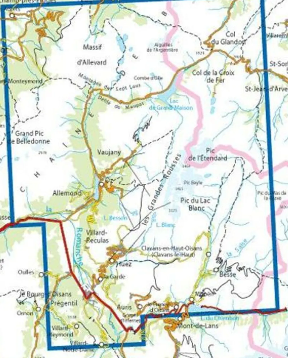 Plaatsen en toppen op de kaart: Grandes ROusses, Sept Laux, Col du Glandon, Col de la Croix de Fer, le Pleynet, deel van de Belledonne, Lac du Chambon.