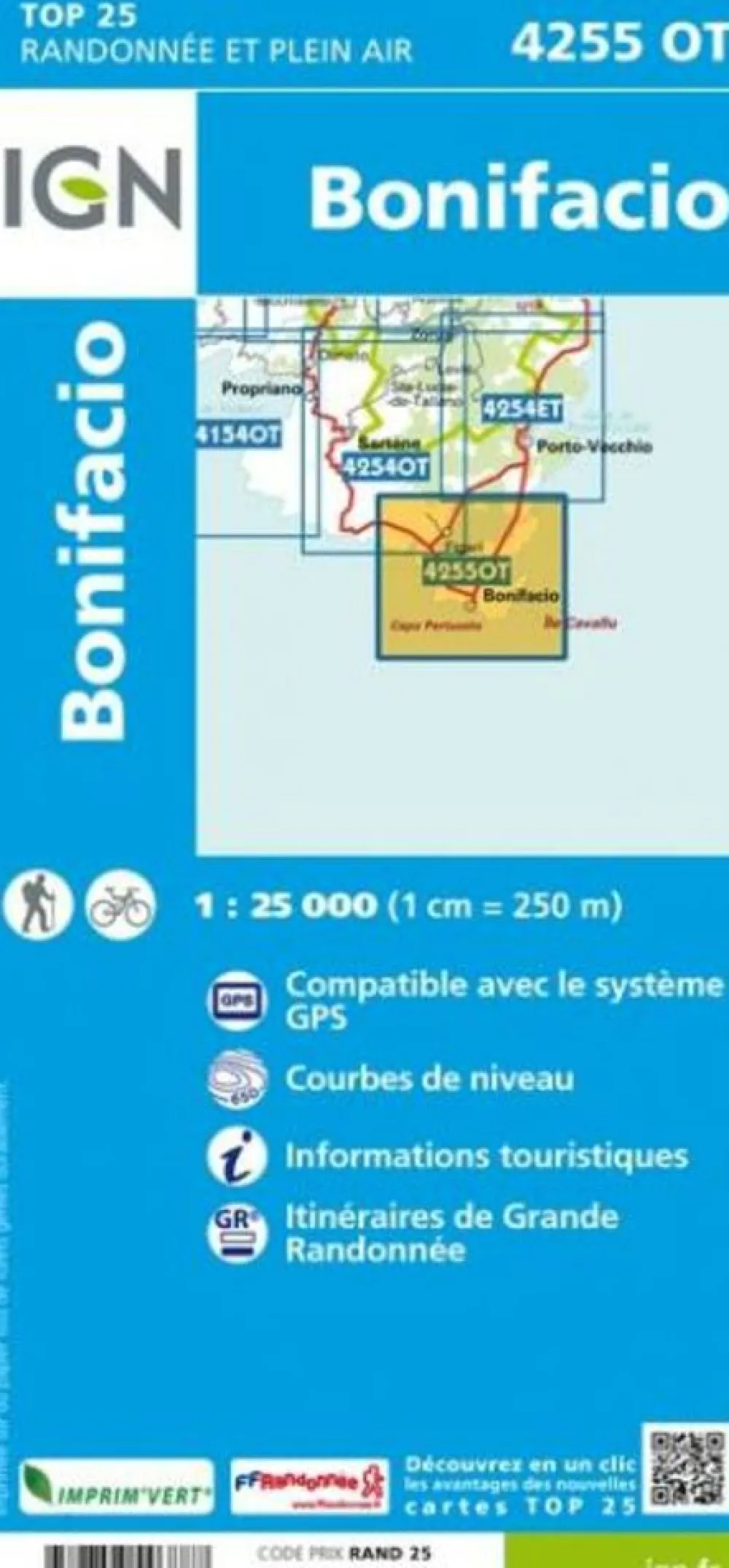 Uitstekende topografische wandelkaart nummer 4255ot Bonifacio: het uiterste zuiden van Corsica, met Bonifacio, Capo Pertusato, Ile Cavallu, Figari.