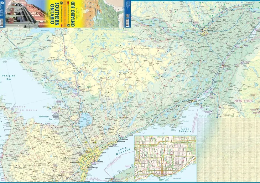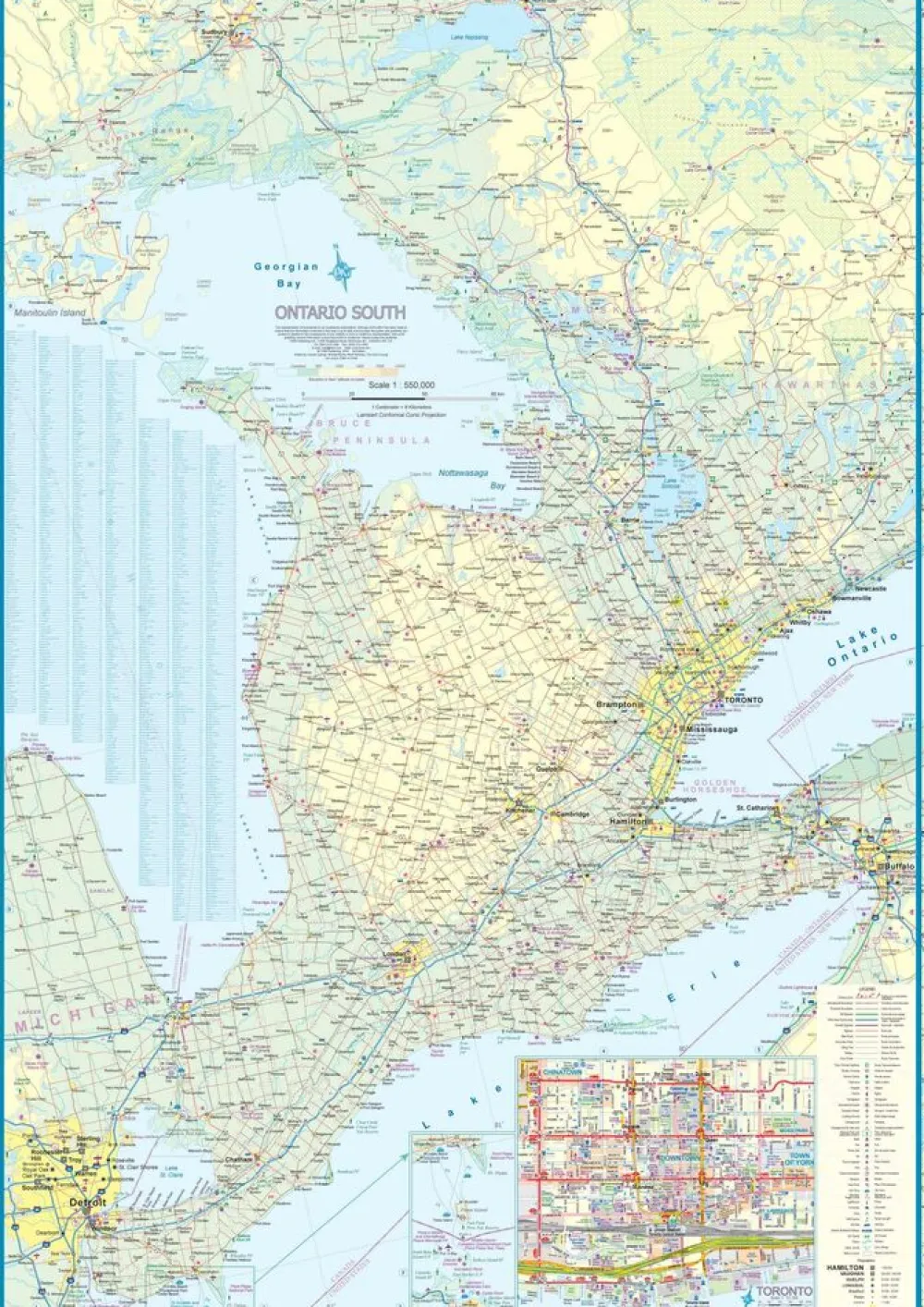 The Canadian province of Ontario is intimidatingly large. It is also mostly tundra with extremely few settlements and few roads; in fact, the geographic centre of Ontario is about 1,500 kms north of the nearest road. The very first map I prepared, at age 10, was of Ontario; and it took me six weeks to trace all the lakes. My point is that the developed portion of the province is a much smaller wedge of fertile ground south of the mineral belt of the Great Canadian Shield. This double-sided map focusses on the area south of Sudbury and North Bay and expands the scale to a much more useful purpose for most users. Imagine Detroit in the southwest corner of the map, with Highway 401 joining it to London and Toronto and a branch motorway cutting across to Buffalo. Add in the Bruce Peninsula and the major routes north to cottage country and you have side one. The other side stretches from Toronto east to the Quebec border and Ottawa, with the lovely Kawarthas region for exploring. My personal favourite highway is Number 7, from Peterborough east through land settled two hundred years ago by Scottish Gaels. Perth is a perfectly preserved Scottish town of granite buildings. The map also includes a regional map of the main roads in the greater Toronto area and a separate inset of the downtown.