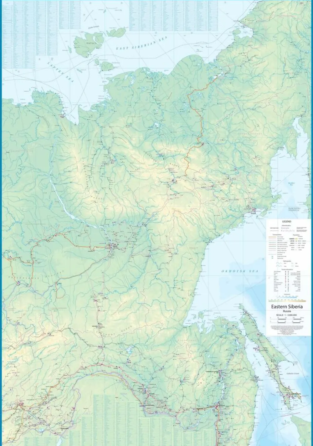 Can you name anyone who has published a detailed map of Siberia? I cannot! This is one of the largest geographical regions on earth, comparable in magnitude to the Sahara or Gobi desert areas, or the vast Prairie regions of Canada, but it has never had a travel map. Well, now it does and the last frontier of mapping the world has been breached. The part of Russia east of the Ural Mountains is vast; there is no other word to describe the enormity of this region of grassland and tundra. Technically, it does not extend all the way to the Pacific Ocean, but it does go from the Arctic Ocean to the Chinese and Mongolian borders. This is not a part of the world well travelled, but it could become so with a good, detailed map. We start in the west at Omsk on the Irtysh River, where the northern and southern branches of the Trans-Siberian Railway line cross each other. I am afraid that most of the cities of the region would not be well known, but I notice Novosibirsk, Irkutsk, and Lake Baikal. This is wilderness with a capital W, a region waiting to be discovered by intrepid travelers. Go for it! You can actually drive across Siberia now, as well as go by train. We actually discovered a road going all the way to the Arctic Ocean!