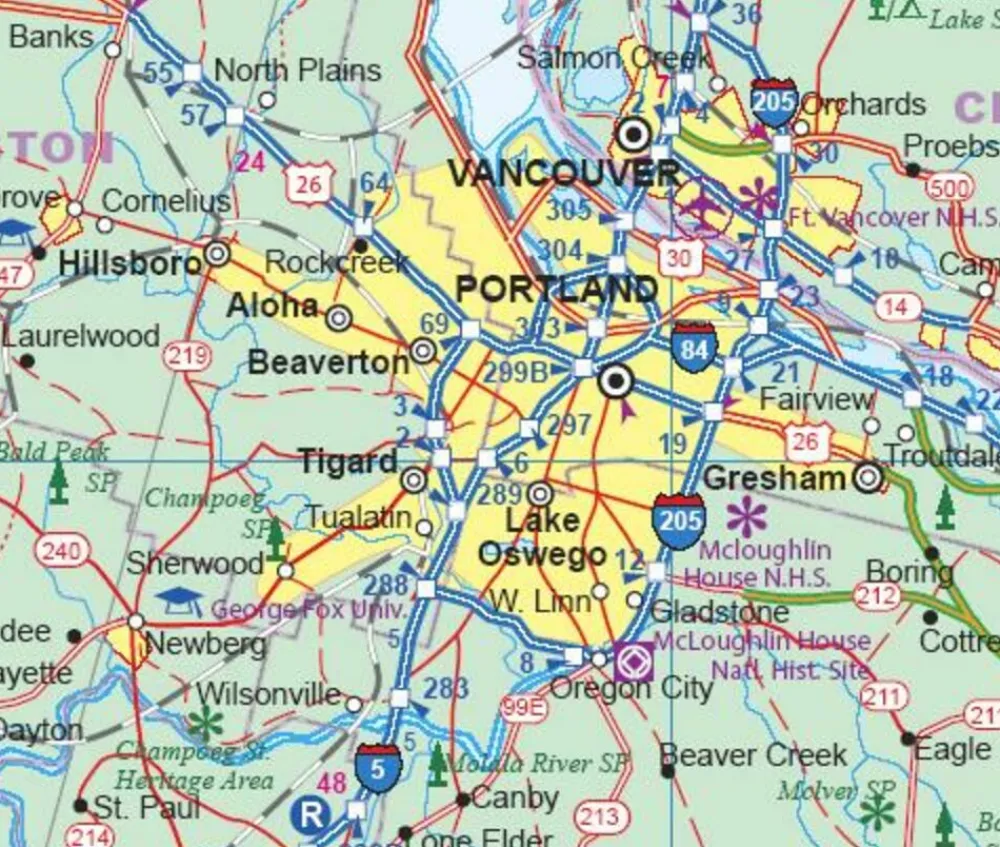 Wegenkaart van de Pacific Northwest, inclusief de staten Washington, Oregon en Idaho: