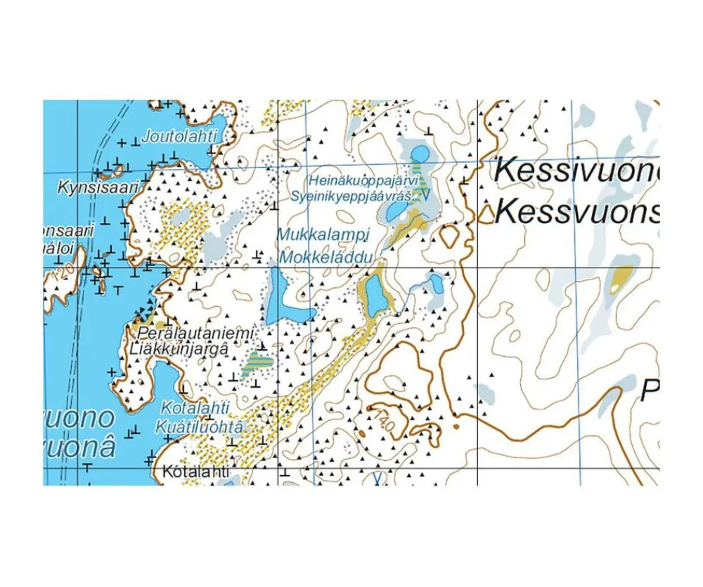 The topographic map is the best choice for such Lapland areas preferred by hikers, fishermen and hunters, for which outdoor maps have not been published and which have required the acquisition of several traditional terrain maps to move in the area.