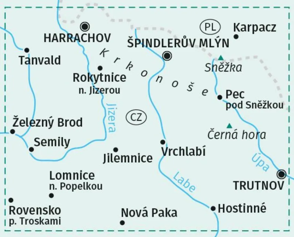 Harrachov, Spindleruv Mlyn, Karpacz, Tanvald, Rokytnice, Pec pod Snezkou, Zelezny Brod, Semily, Vrchlabi, Jilemnice, Lomnice n. Popelkou, Trutnov, Rovensko p. Troskami, Nova Paka, Hostinne