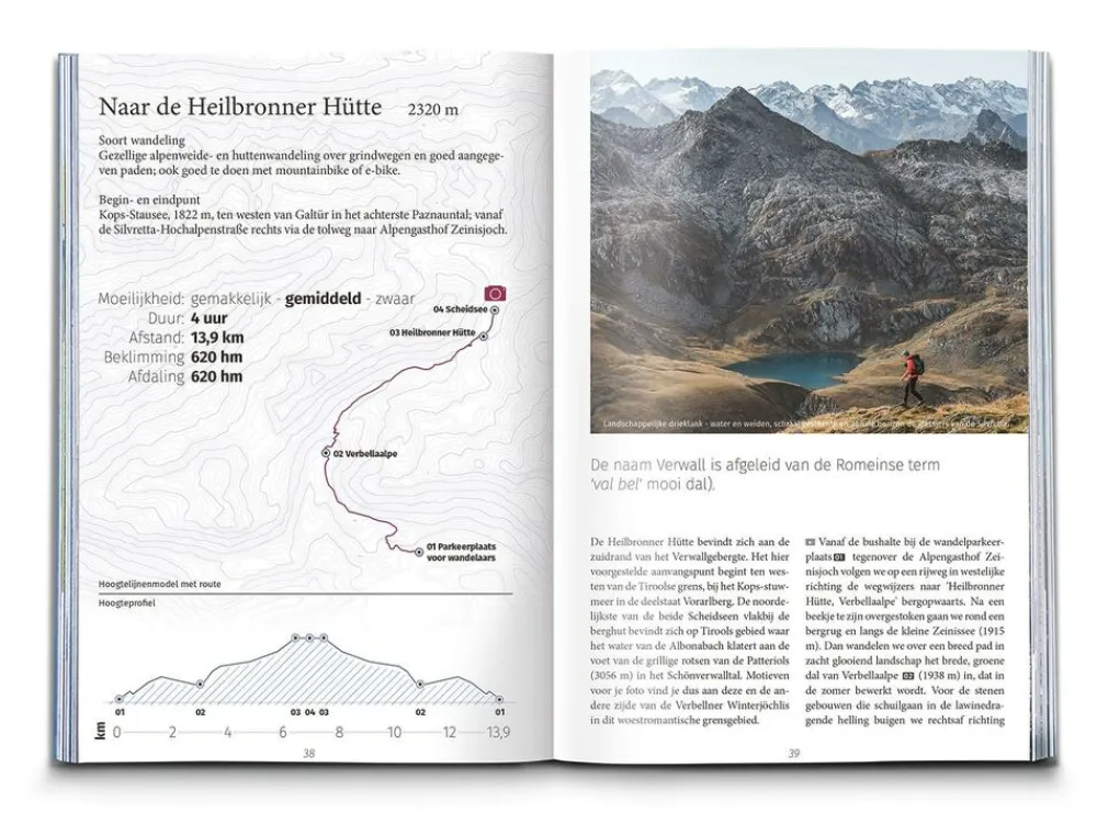 Deze beetje glossy wandelgids beschrijft 30 wandeltochten, ingedeeld naar gemakkelijk, gemiddeld en zwaar. De nadruk ligt op gemakkelijk, wat meestal wandelingen zijn van ongeveer 3 uur zonder enorme hoogteverschillen. Het zijn goede wandelingen voor de beginnende of minder ambitieuze wandelaar die wel op deze manier het gebied wil leren kennen. De foto’s geven het geheel een ‘lekker’ sausje waar je wel enthousiast van wordt. Naast een goede beschrijving van de wandeltocht met hoogteprofiel en wat andere praktische informatie is elke wandeling voorzien van een kaartfragment met schaal 1:50.000