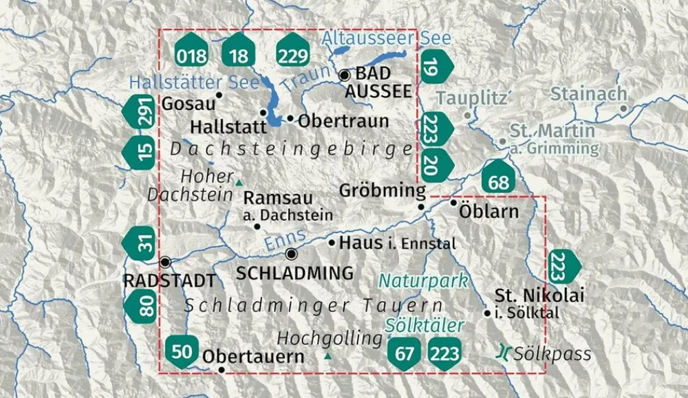 Bad Goisern, Bad Aussee, Gosau, Hallstatt, Obertraun, Pichl-Kainisch, Gröbming, Öblarn, Ramsau, Radstadt, Schladming, Haus, Donnersbachwald, St. Nikolai, Untertauern, Obertauern