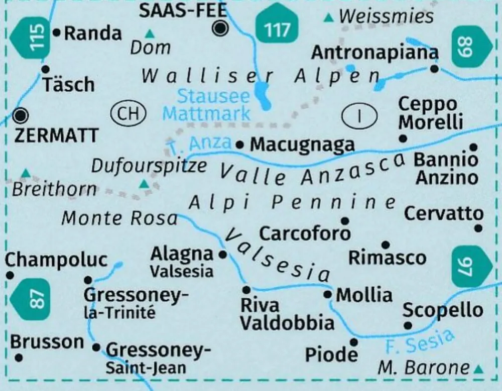 Saas-Fee, Randa, Antronapiana, Ceppo Morelli, Macugnaga, Zermatt, Cervatto, Rimasco, Scopello, Mollia, Piode, Riva Valdobbia, Alagna, Gressoney-la-Trinité, Gressoney-Saint-Jean, Brusson