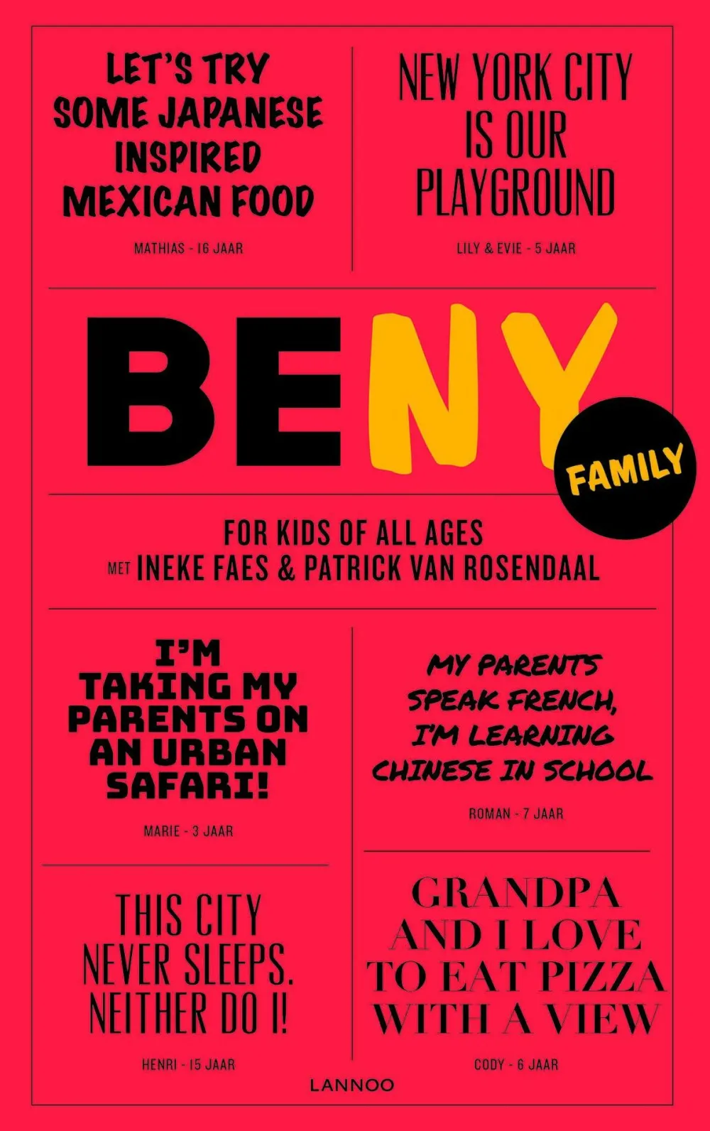 In BE NY Family vertellen de auteurs hoe het leven van kinderen eruitziet in deze miljoenenstad. Om New York te verkennen, zijn er geen leeftijdsgrenzen: vanuit de draagdoek, met rolschaatsen of op een skateboard, het kan allemaal.