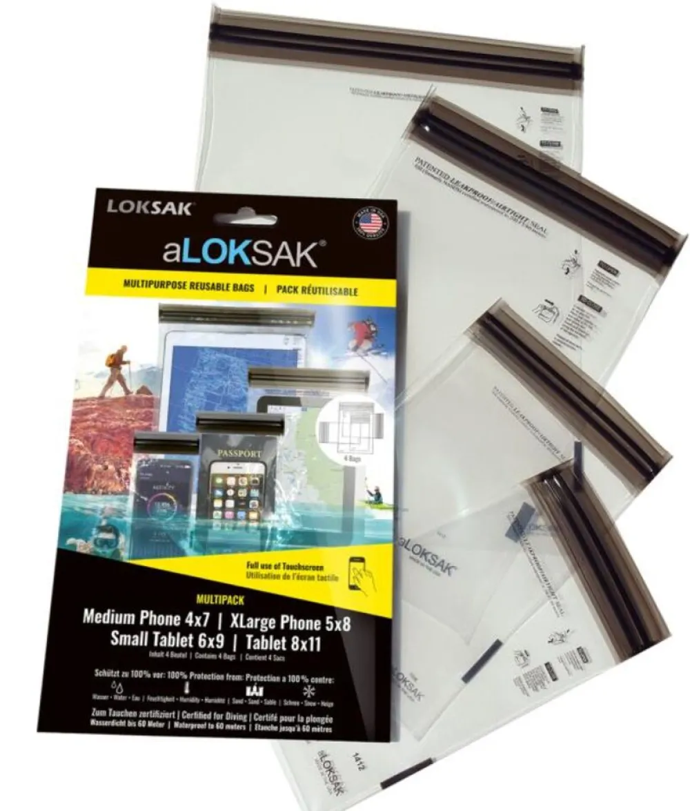 De aLOKSAK zakjes van LOKSAK zijn opbergzakken met een hermetische afsluiting. Dat betekent dat er absoluut geen water, lucht, stof of sneeuw de sluiting kan doordringen. Bovendien zijn de zakjes touchscreen-gevoelig en kan je ermee bellen en gebeld worden. Deze set bestaat uit vier zakjes van verschillende afmetingen: