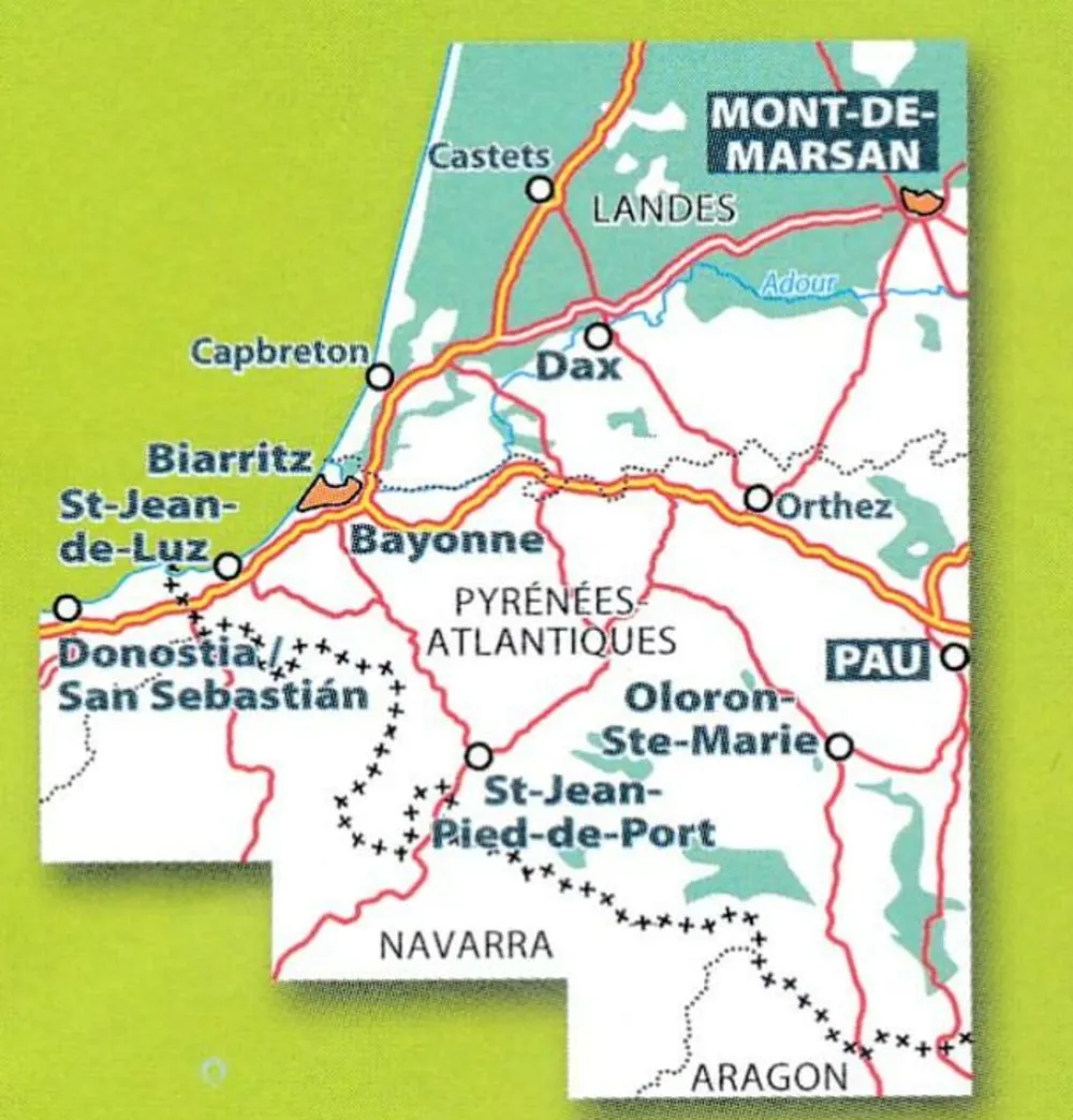 Toeristische wegenkaart Zoom 133 van de Frans-Baskische Kust en het zuiden van Les Landes, het grote bosgebied tussen Bordeaux en de Pyreneeën.bezienswaardigheden en pittoreske routes. Door de schaal ook te gebruiken als fietskaart.