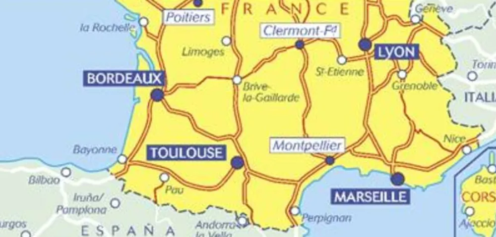 Uitstekende overzichtelijke wegenkaart van het zuideljk deel van Frankrijk: grofweg alles ten zuiden van Poitiers – Geneve.