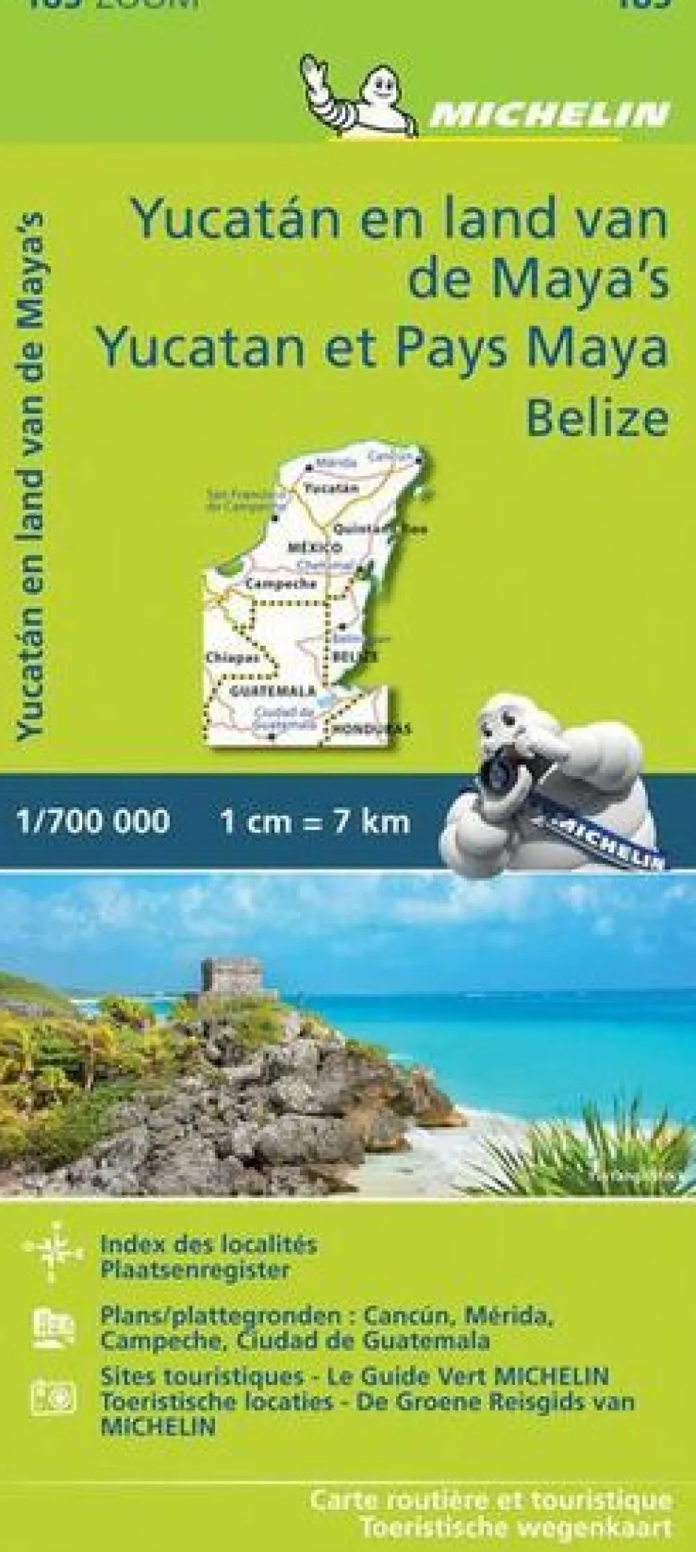 Toeristische wegenkaart Zoom 183 van het Mexicaanse schiereiland Yucatan. Met Belize en een deel van het noorden van Guatamala. Op deze kaart zijn de Nationale Parken goed zichtbaar ingetekend met een heldere achtergrondkleur. Met kleine stadsplattegronden van Cancun, Mérida, Campeche en Ciudad de Guatemala.