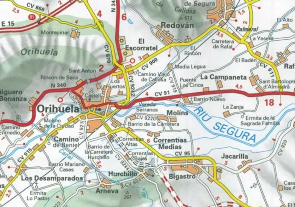Wegenkaart van de Costa Blanca met de stad Murcia en Alicante. Vanwege de schaal van 1:130.000 goed te gebruiken als fietskaart.