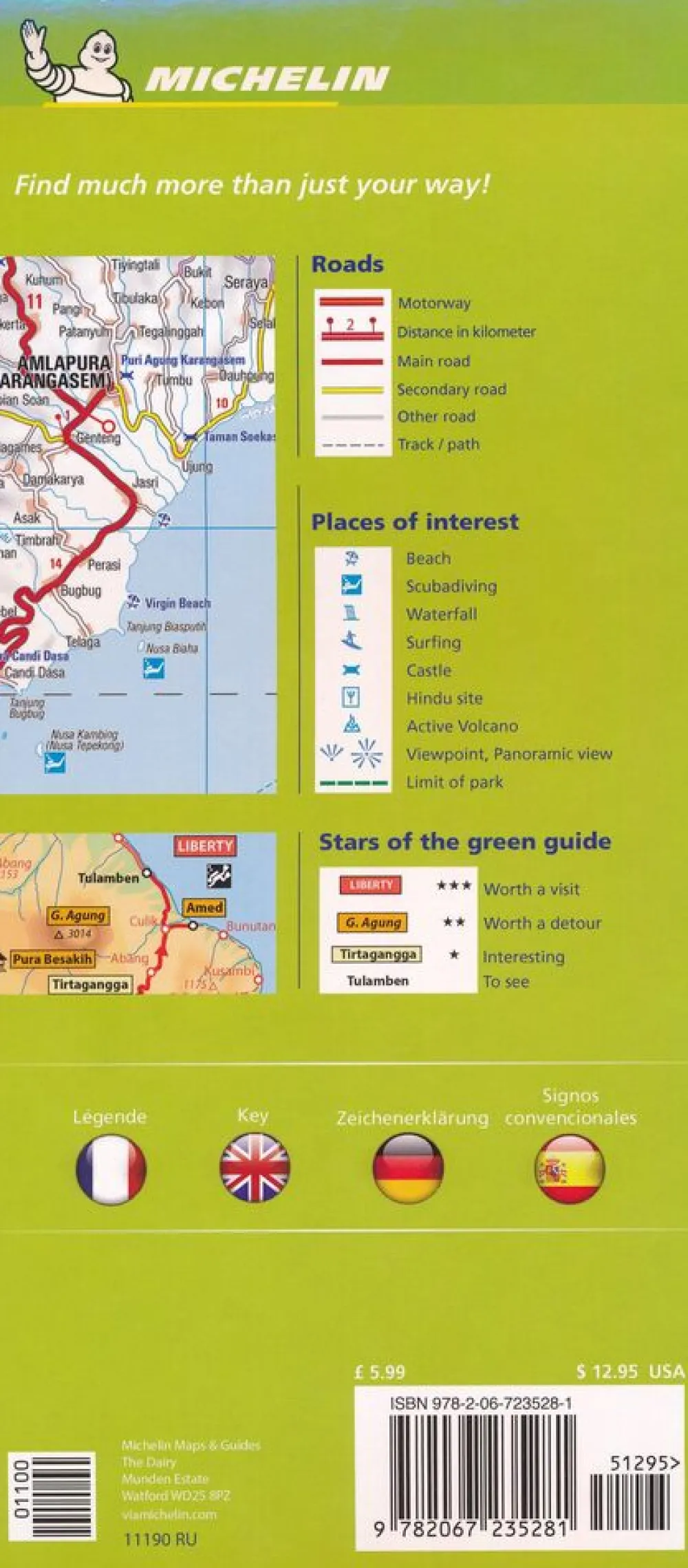 Zoals altijd levert Michelin een zeer leesbare kaart met alle gewenste details. Alle berijdbare wegen zijn duidelijk ingetekend, en de mooiste stukken worden aangegeven met groene lijnen. De kaart bevat ook plattegronden van het centrum van Denpasar, Kuta en Mataram. De Michelin Bali-Lombok Road and Tourist ZOOM Map 190 bevat een index van plaatsnamen, toeristische sites uit de Michelin reisgidsen en stadsplattegronden van Denpasar, Kuta en Mataram. De schaal is 1:180.000 (1 cm = 1,8 km).