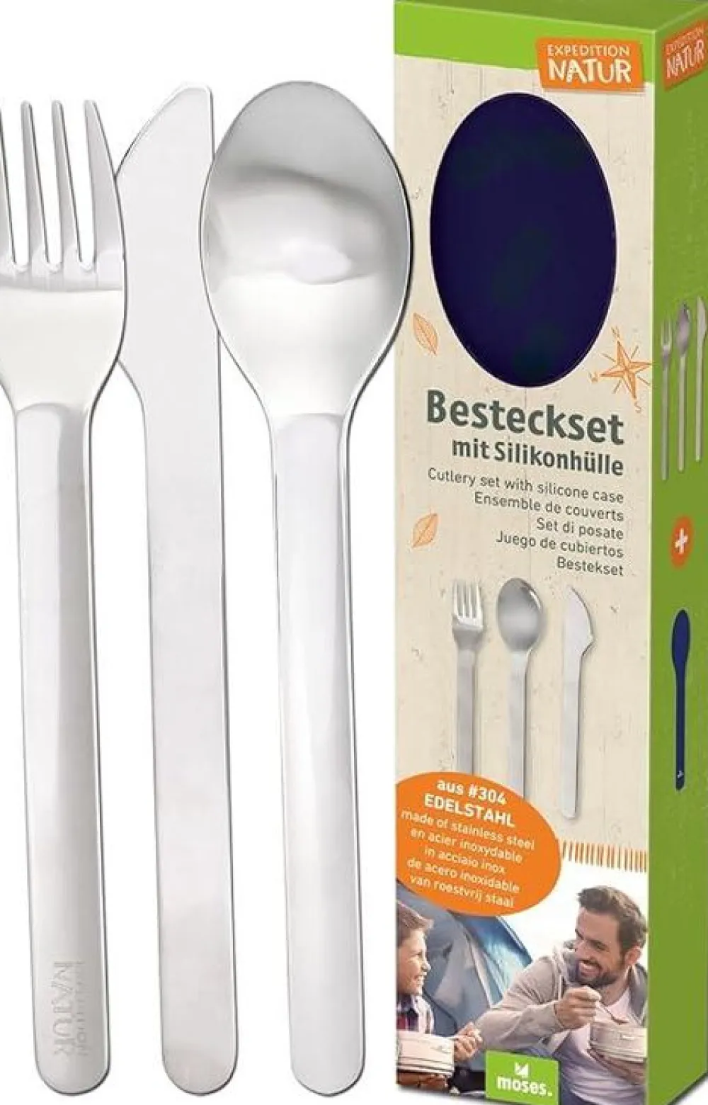 Perfect voor kleine avonturiers. Dit 3-delige eet set met vork, lepel en mes bestaat uit robuust, roestvrij staal.