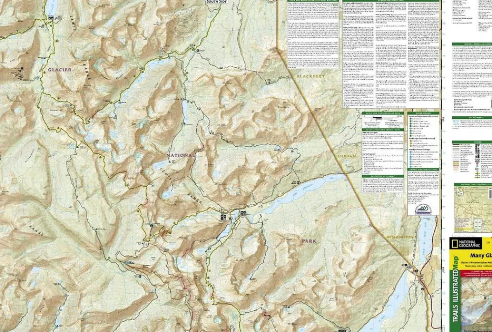 Topografische wandelkaart, scheurbestendig en watervast, van de Nationale Parken Glacier en Waterton Lakes in Montana en Alberta.