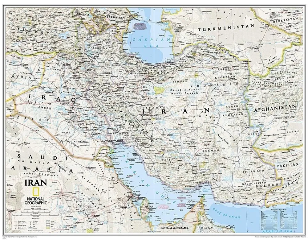 This new map of Iran, features the classic National Geographic reference styling. Features thousands of place names, accurate political boundaries, national parks, archeological sites, and major infrastructure networks such as roads, canals, ferry routes, and railroads. Iran’s diverse terrain is detailed through accurate shaded relief, coastal bathymetry, and symbolism for water features and other landforms. This map also includes table of geographic equivalents translated into English. Elevations of major peaks and depth soundings are expressed in meters. In addition, the bordering countries of Iraq, Turkey, Armenia, Azerbaijan, Turkmenistan, Afghanistan, and Pakistan are shown as well as outlying countries including Syria, Uzbekistan, United Arab Emirates, Oman, Kuwait, and Saudi Arabia.