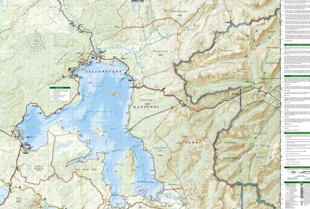 With many miles of mapped trails and marked Bear Management Zones the Yellowstone Lake map can guide you off the beaten path and back again. The clearly marked trails include mileages between intersections. The map base includes contour lines and elevations for summits, passes and many lakes. Some of the many recreation features include: visitor centers, campgrounds, boat ramps, trailheads, and interpretive trails.