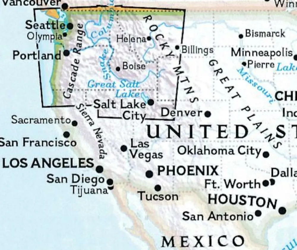 Wegenkaart / landkaart van het noordwesten (Pacific Northwest van de Verenigde Staten: Idaho, West-Montana, Noord-Californië, Washington State, Yellowstone, Seattle.