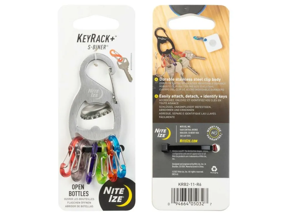 De KeyRack+ S-Biner is een stalen sleutelhanger met 6 lichtgewicht S-biners van polycarbonaat in verschillende kleuren, voor een goede herkenbaarheid en onderscheid tussen je sleutels. De sleutelhanger is ook te gebruiken als flesopener.