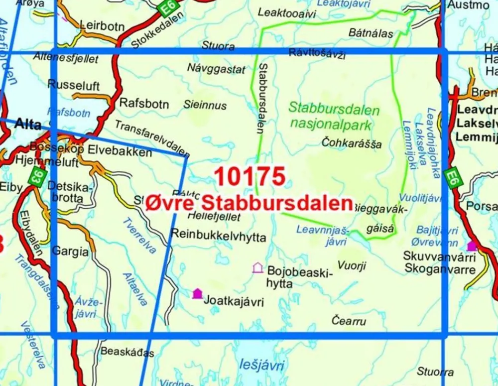 Uitstekende topografische wandelkaart 10157 van Nordreisa, bij Troms. Met UTM-grid. Uit de Norge-serie:
