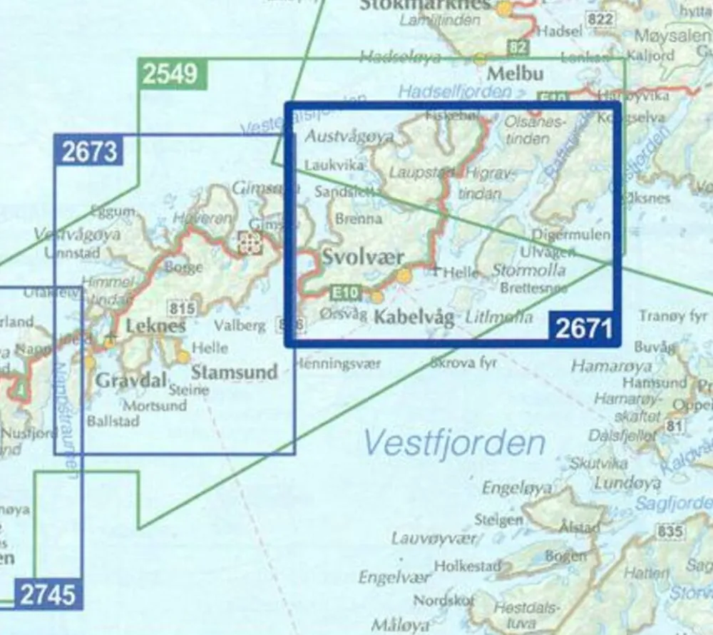 Uitstekende, topografische wandelkaart 2671 Vagan: deze detailkaart bestrijkt het noordoosten van de Lofoten.