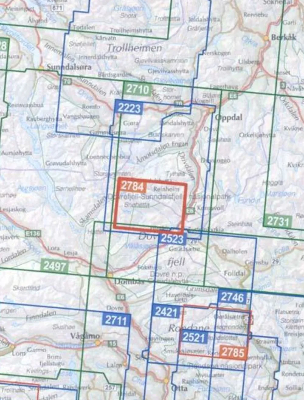 Uitstekende topografische wandelkaart 2784 Snoheim: een gebied in Nationaal Park Dovrefjell-Sunndalsfjella.