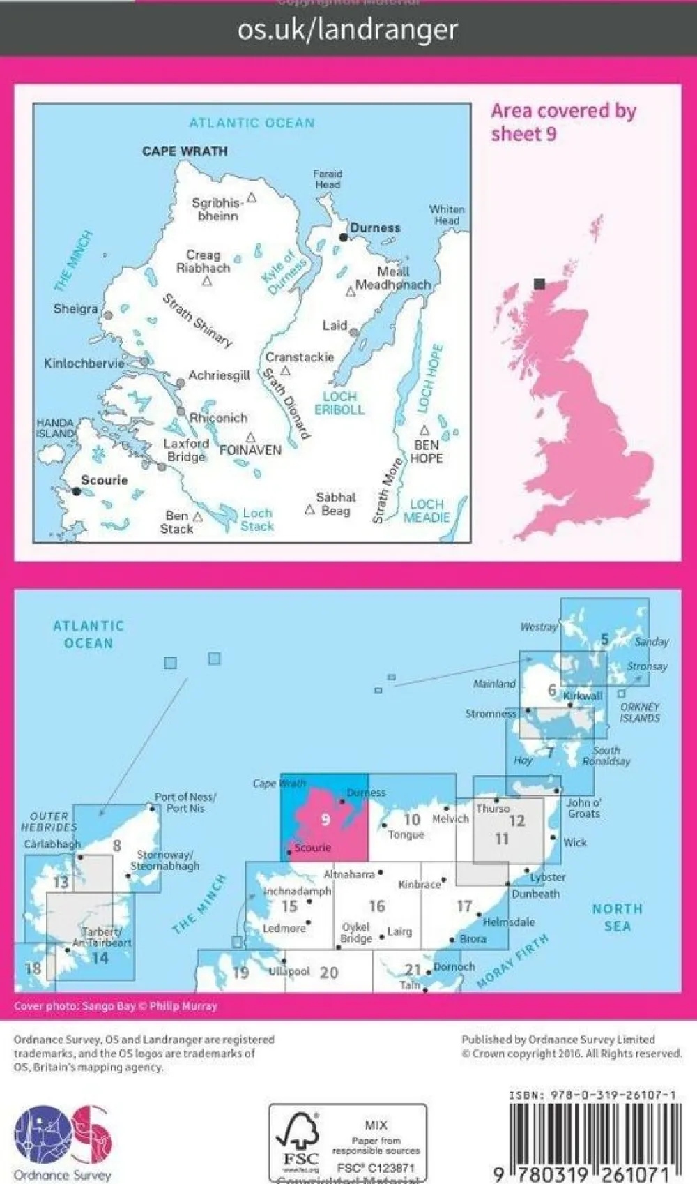 Zeer gedetailleerde, topografische wandelkaart Ordnance Survey Landranger 009 voor het gebied rond Cape Wrath