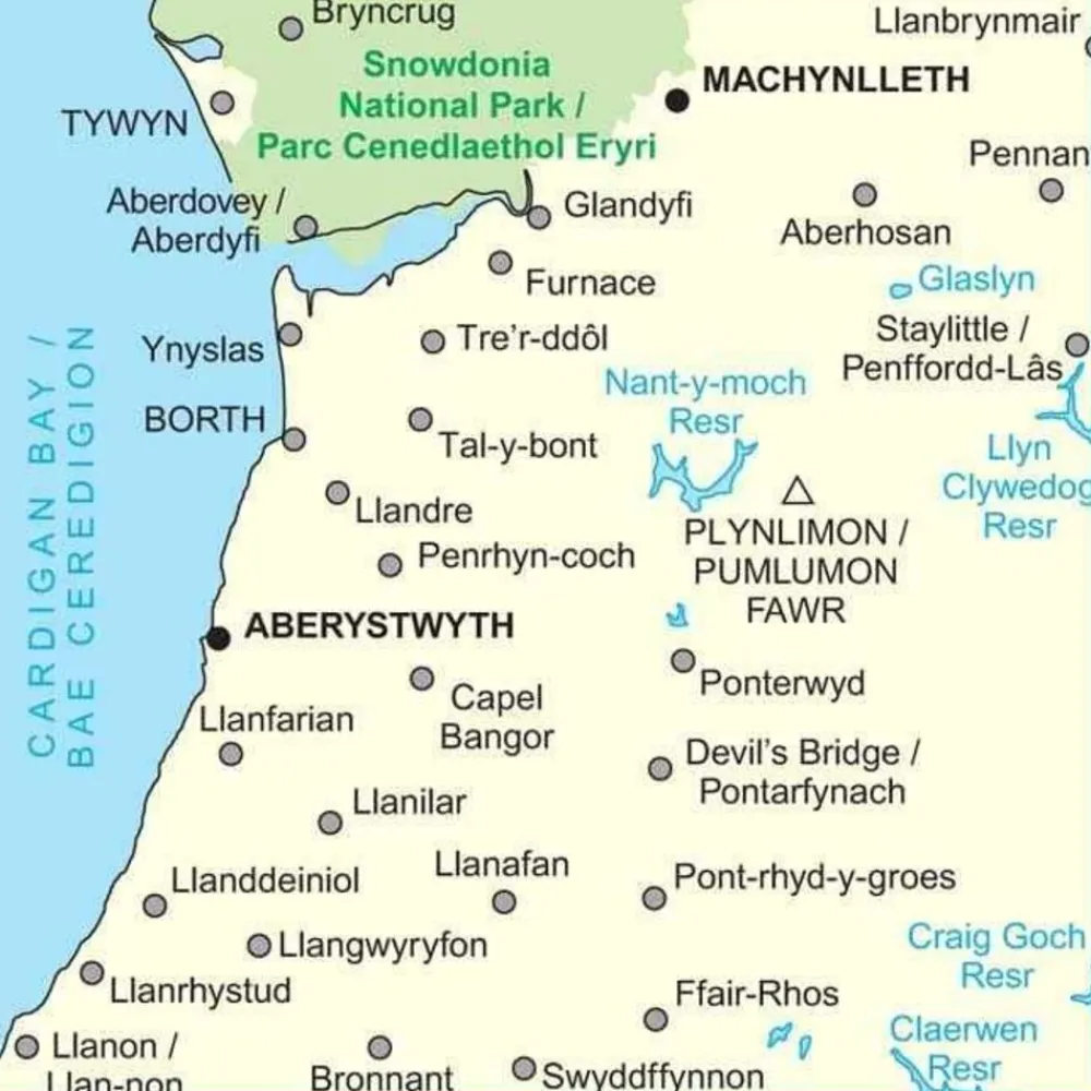 Plaatsen op de kaart: Llanddeiniol, Aberhosan, Machynlleth, Aberystwyth.