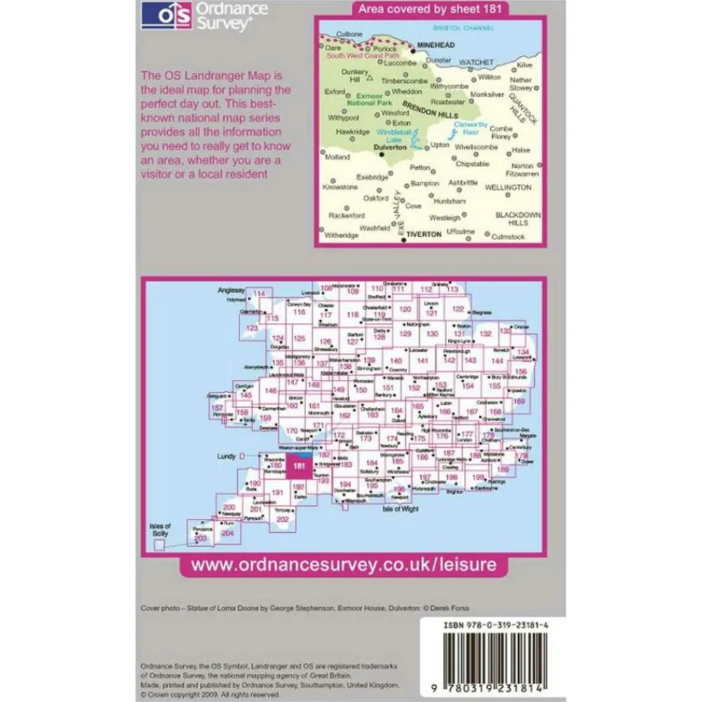 Zeer gedetailleerde, topografische kaart Ordnance Survey Landranger 181 voor het oostelijk deel van Exmoor in Devon.