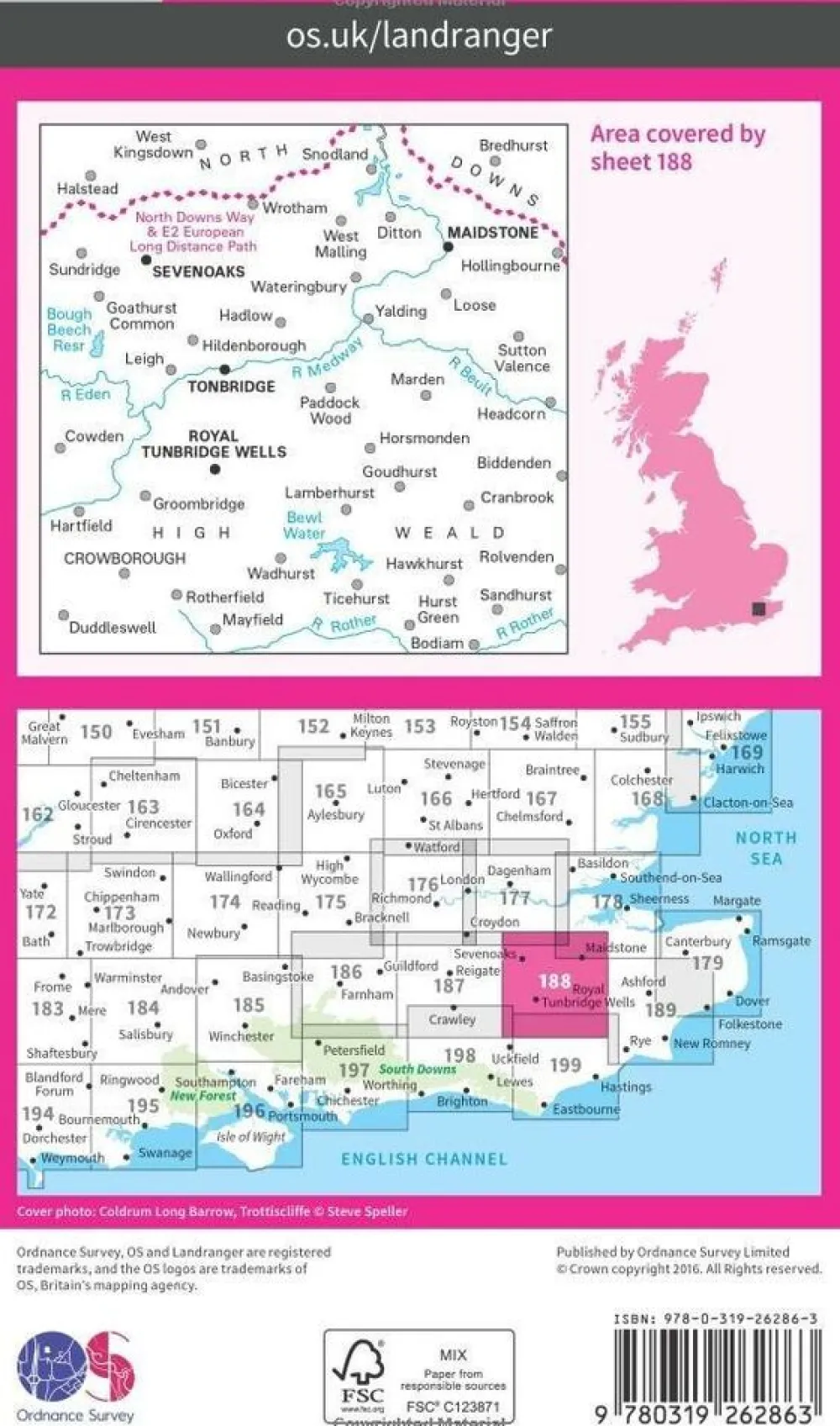 Zeer gedetailleerde, topografische kaart Ordnance Survey Landranger 188 voor het gebied rond Maidstone & Royal Tunbridge Wells:met een groot deel van de High Weald, een Area of Outstanding Natural Beauty (AONB).