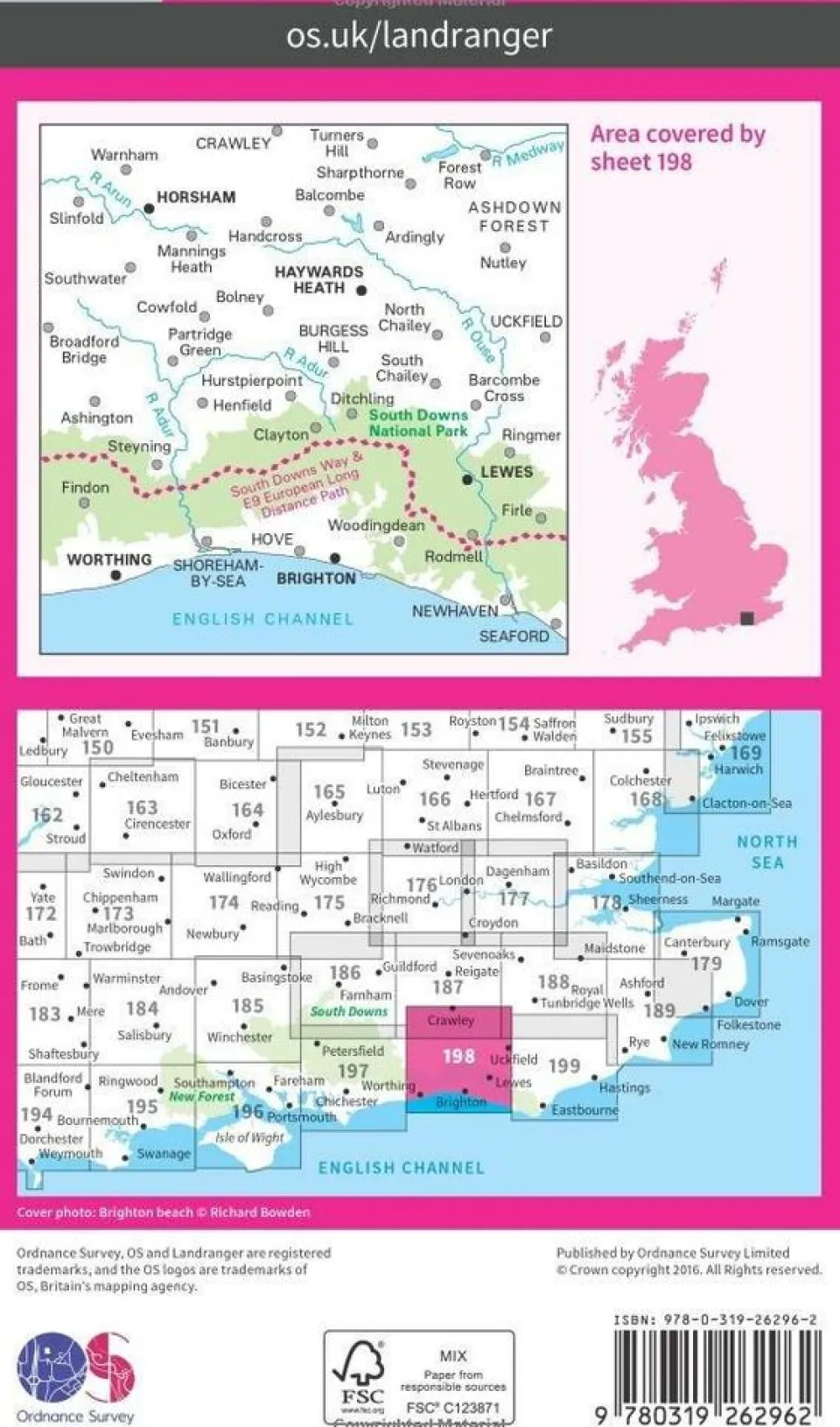 Zeer gedetailleerde, topografische kaart Ordnance Survey Landranger 198 voor het gebied rond Brighton – Lewes: met een deel van de South Downs.