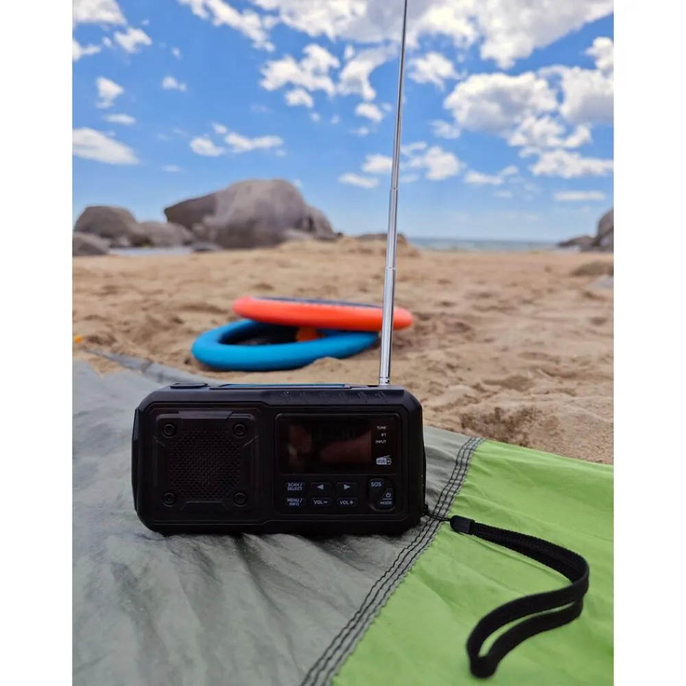 De compacte en robuuste zwengelradio is altijd en overal inzetbaar. Hij ontvangt berichten via FM, DAB+ en heeft de optie om verbonden te worden via Bluetooth. De radio heeft een geïntegreerde en oplaadbare lithiumbatterij die kan worden opgeladen via USB Type-C, de geïntegreerde zwengelgenerator of, in geval van nood, via de geïntegreerde zonnecel in de zon. Daarnaast kan de noodradio ook worden gebruikt met standaard AAA-batterijen. Uitgerust met powerbank (4000mAh), zaklamp en leeslamp, wekker, datum- en tijdweergave, geheugen voor maximaal 40 zenders, hoofdtelefoonaansluiting, SOS-alarmknop en ophanglus. De krachtige zaklamp kan worden gebruikt met drie verschillende lichtstanden. De SOS alarmknop activeert een luid alarm om aandacht te trekken in geval van nood. Ideaal voor kamperen en buitenactiviteiten.