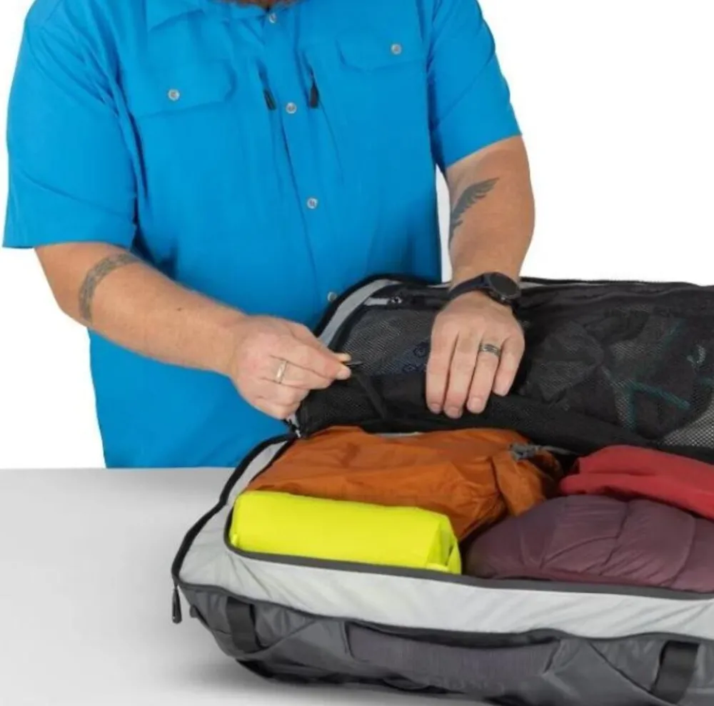 - Duffel met dubbele ingang met zowel 50/50 clamshell-toegang als traditionele top-loading-stijl met oprolbare verdelers