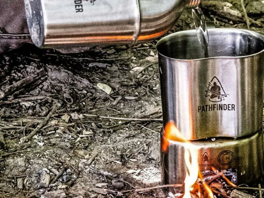 De Pathfinder RVS veldfles kookset, bestaande uit een veldfles met een wijde hals (1,15 L), een keteltje met deksel (0.7 L) en een kookplaatje. De gehele set is stapelbaar en past precies in de bijgeleverde draagtas met molle bevestiging. Kan rechtstreeks op een brander of op het vuur/kolen verwarmd worden.
