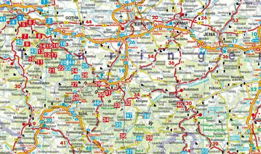 Uitstekende, compacte Duitstalige wandelgids met 50 wandelingen in het midden en noorden van de staat Thüringen, tussen de plaatsen Saale, Kyffhäuser en Nationaal Park Hainich.