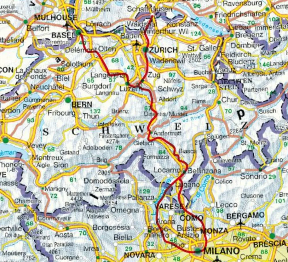 -route is onderverdeeld in 30 etappes: U kunt beginnen in Basel of Schaffhausen en via luzern naar Bellinzona lopen. Daar kunt u kiezen tussen een variant via het Lago Maggiore of via Como om in Milaan te eindigen.
