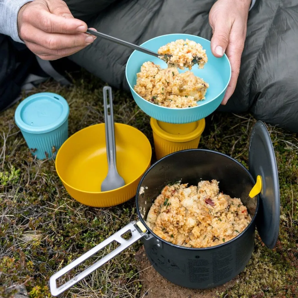 De lichtgewicht en duurzame aluminium bestekset bestaat uit een lepel en spork met extra lang handvat. De meegeleverde adapter maakt van de set een tang.