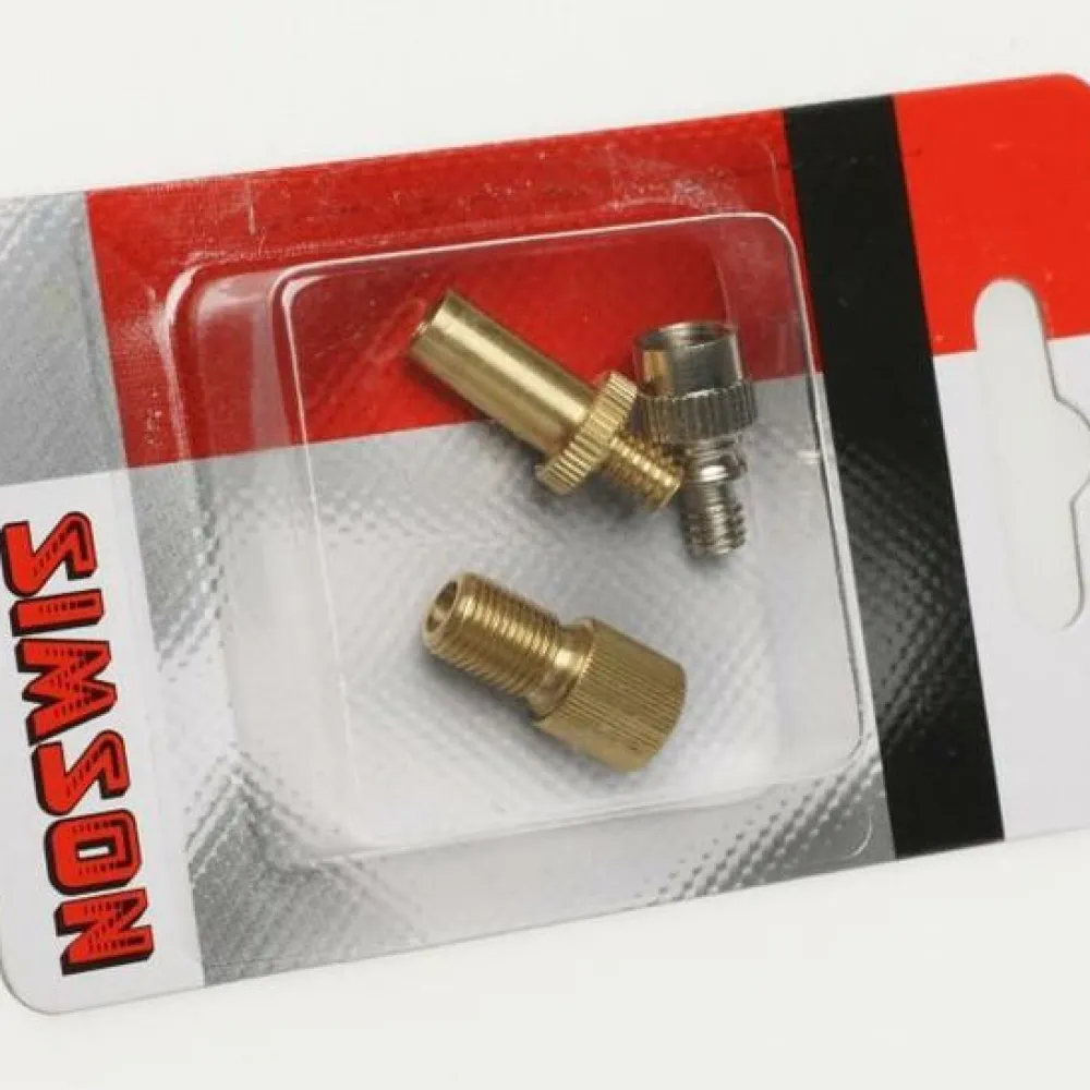 Deze oppompnippelset van Simson zorgt dat u uw band kan oppompen ongeacht welk ventiel u heeft.
