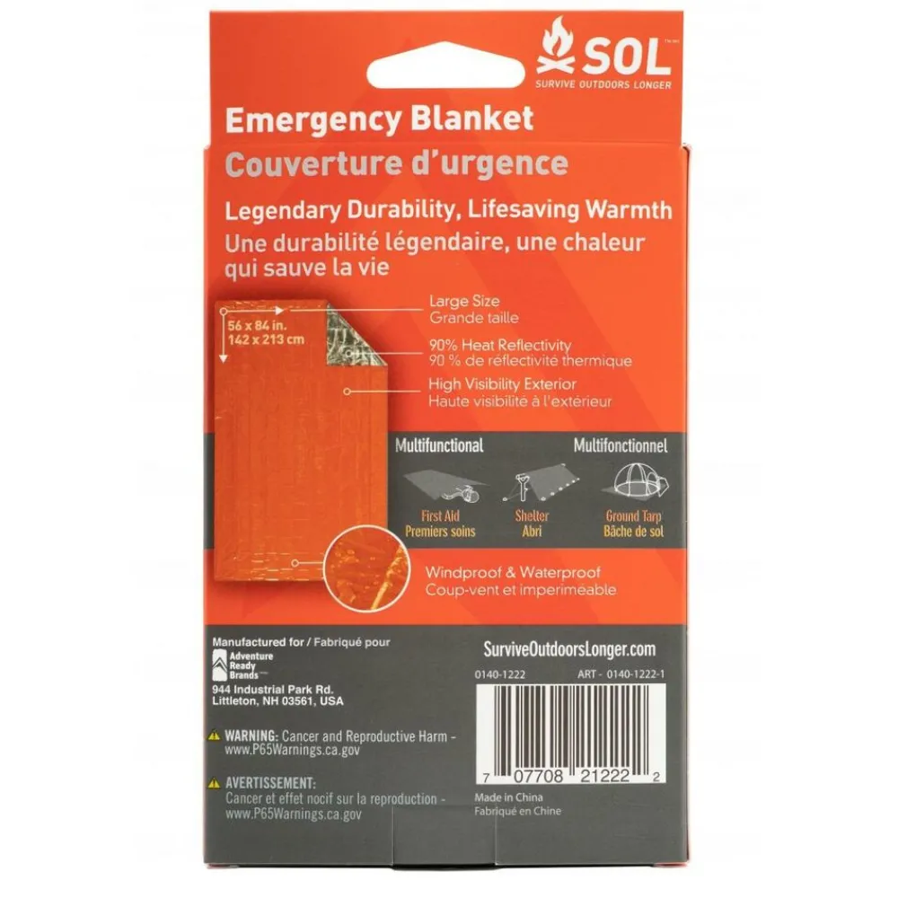 De SOL Thermische Nooddeken is de meest geavanceerde nooddeken op de markt – zorgvuldig ontworpen om nooit te falen als je er met je leven op rekent. Het begint allemaal met het materiaal, vacuüm gemetalliseerd polyethyleen, dat 90% van je lichaamswarmte reflecteert en tegelijkertijd een aantal andere belangrijke kenmerken biedt die het onderscheiden van traditionele mylar-dekens; hij gaat gemakkelijk open en scheurt niet als hij wordt ingekerfd of doorboord, scheuren kunnen worden gerepareerd, hij is stil en kreukt niet bij harde wind, en zijn goed zichtbare oranje buitenkant maakt het voor reddingswerkers gemakkelijk om je te vinden. Op maat gemaakt voor één persoon.