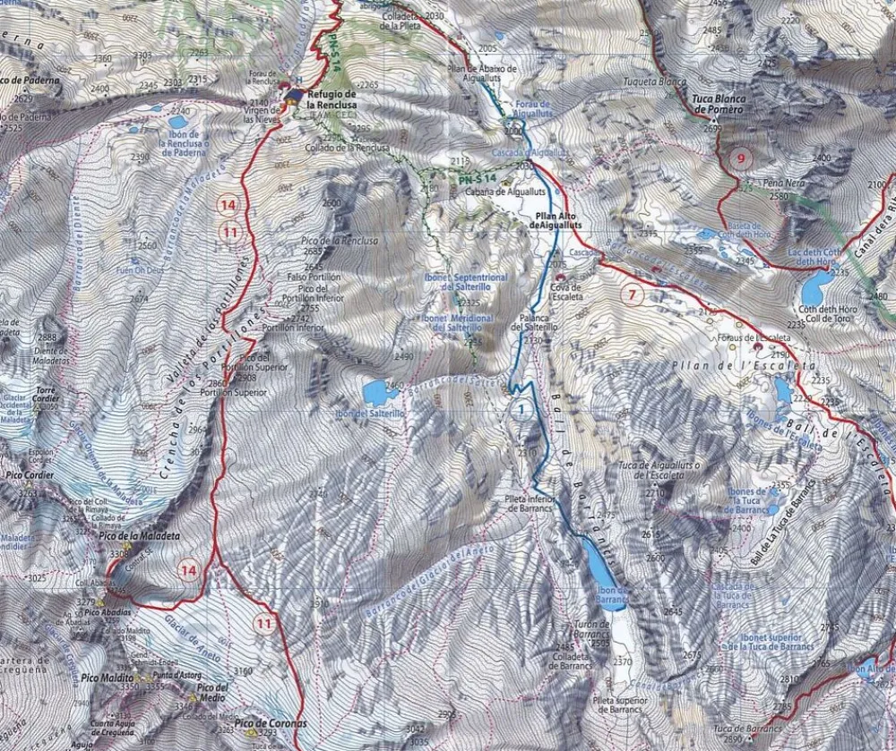 Zeer mooie en gedetailleerde, topografische wandelkaart van het grensgebied van Frankrijk en Spanje in de Pyreneeën/ Baskenland: rond de Maladeta en Pic Aneto.