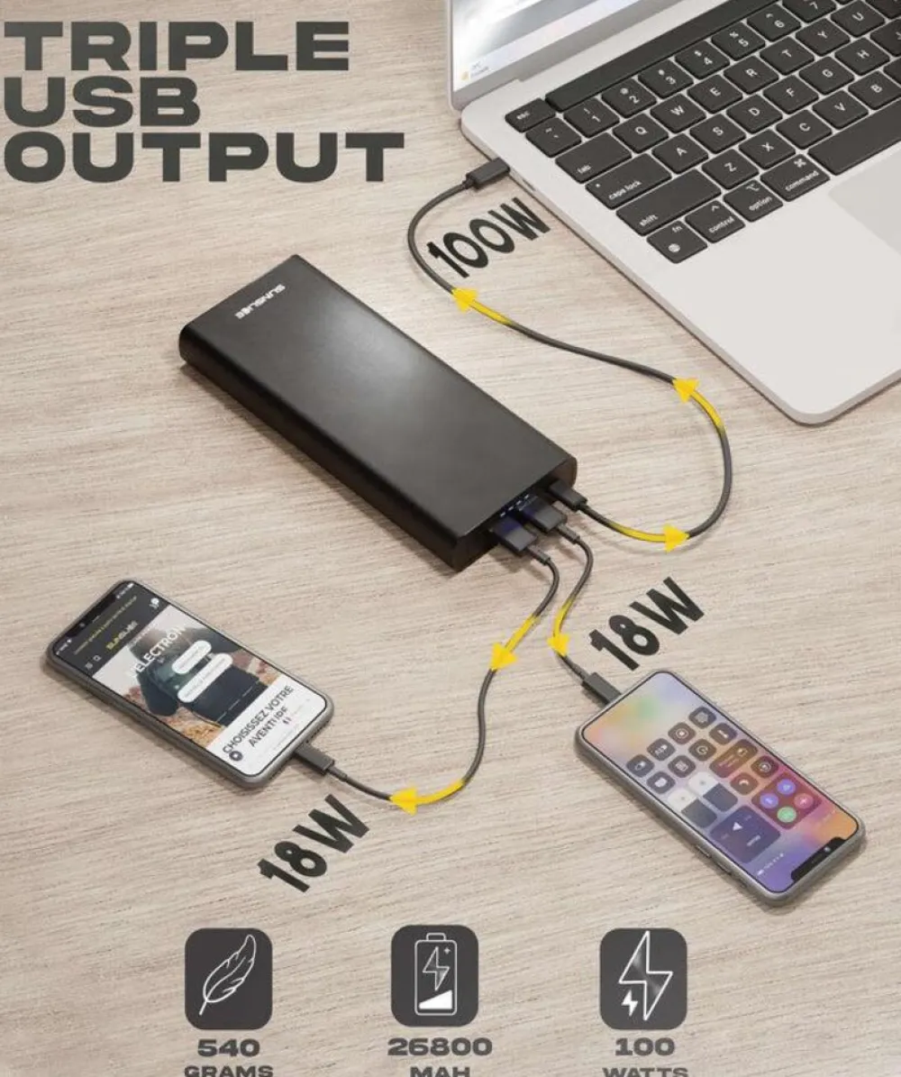 De Gravity 100 is een krachtige powerbank van 26.800 mAh ontworpen voor laptops. Het is uitgerust met de nieuwste USB-C Power Delivery (PD) technologie, wat betekent dat het laptops en telefoons kan opladen. De USB-C PD uitgang van 100W maakt het mogelijk om elke laptop op te laden die tot 100W nodig heeft.
